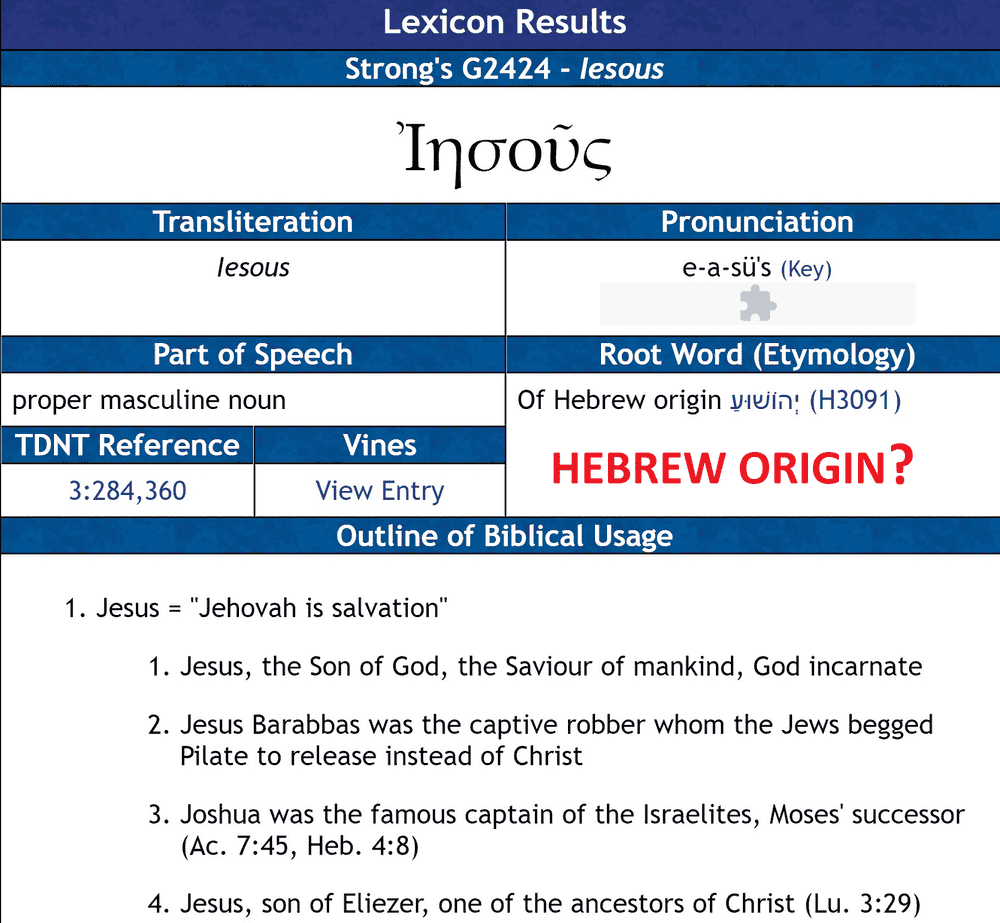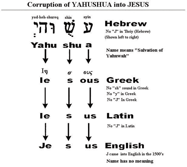 So where does it come from? Jesus was derived from the Greek name 'Iesous'. Note here that the lexicon above states that the Greek name Iesous is of Hebrew origin. Iesous was erroneously transliterated from the Hebrew name of the Messiah—'Yahushua'—as you can see from the table below.