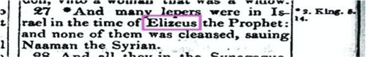 Instead of using the name for the prophet 'Elisha', the name 'Elizeus' has been used. The name Elisha—rendered, 'Elishua' in Hebrew—means 'God is Salvation'. Elizeus means 'god is Zeus'. So, we clearly see how the Greeks inserted their pagan god's name into scripture.